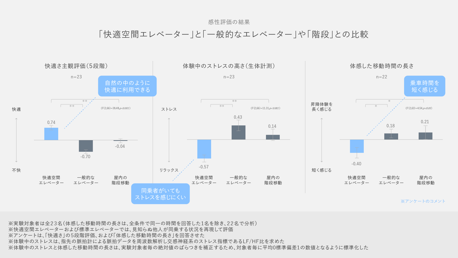 一方、一般的なエレベーターは23人中16人が「同乗者に対する気まずさ」「不快さ」を感じて評価が低く、ストレス感も高い結果となりました。
