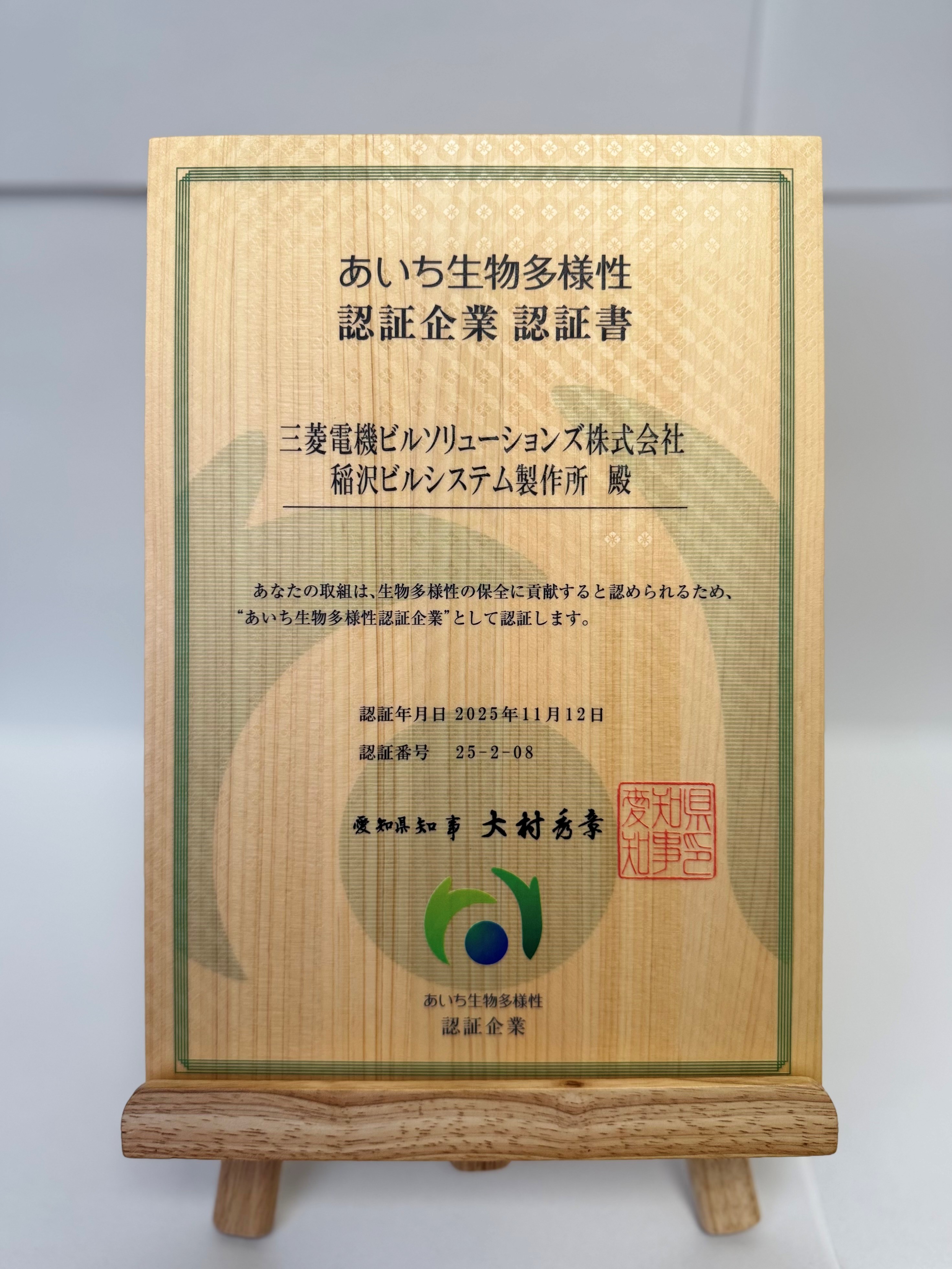 この認証は、同県が「あいち生物多様性企業認定制度」に基づき、各企業の生物多様性保全の活動を促進するものです。稲沢ビルシステム製作所における、緑地環境の整備や鳥類の生息環境と生態系の維持・保護活動などが評価されました。