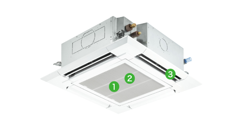 フィルターでとりきれない汚れが内部に付着すると冷暖房能力の低下や、水漏れの危険性も。汚れ・目詰まりがないかを確認し、トラブルを防止します。