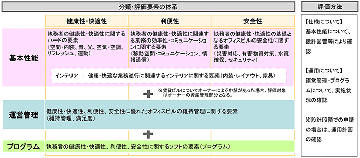 オフィス環境の維持管理や働く人の満足度を確認するための措置も取っているなど、運営管理も適切に行われていることがポイントです。メンタルヘルス対策や運動促進プログラムなど、働く人が心身ともに健康な状態で執務できる環境をソフト面でも用意すると良い評価が期待できます。