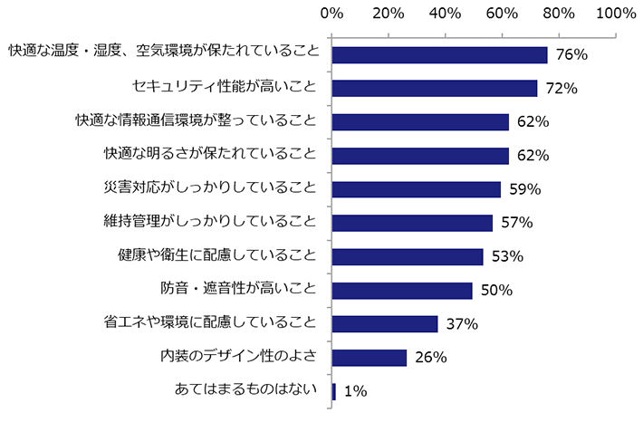 次は、「セキュリティ性能が高いこと」で72%の割合でした。オフィスにおけるセキュリティは防犯面だけでなく情報セキュリティも含まれています。安心して執務するために不審者や情報漏洩を防ぐ対策を構築することが重要です。以下は、スムーズに作業できる情報通信環境、快適な明るさなどが続きます。