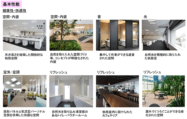例えば、基本性能においては「健康性・快適性」を高めるために空間や内装、音、光、空気・空調などのハード面に配慮することが必要です。効率よく業務を行うために移動空間やコミュニケーション、情報通信など利便性の高いオフィス環境を用意します。働く人の安全を守るため、災害対応やセキュリティなどの対策も欠かせません。