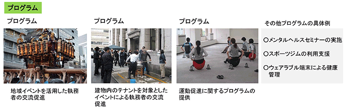 その他、運動促進に関するプログラムの提供やメンタルヘルスセミナーの実施など、ビルの利用者が健康管理に気をつけながら働ける環境を構築しています。