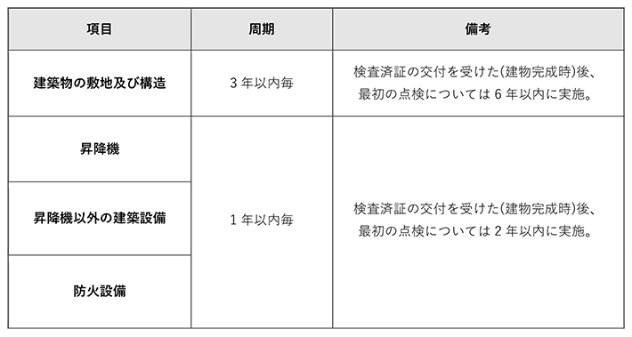 具体的な点検報告の期間は特定行政庁ごとに定められており、例えば東京都では、建築物の敷地及び構造の点検報告時期が以下のように定められています。*3