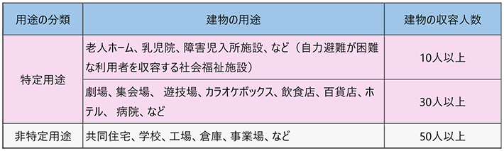 ・主な防火・防災管理関係義務一覧表|東京消防庁(https://www.tfd.metro.tokyo.lg.jp/lfe/office_adv/jissen/p12.html)