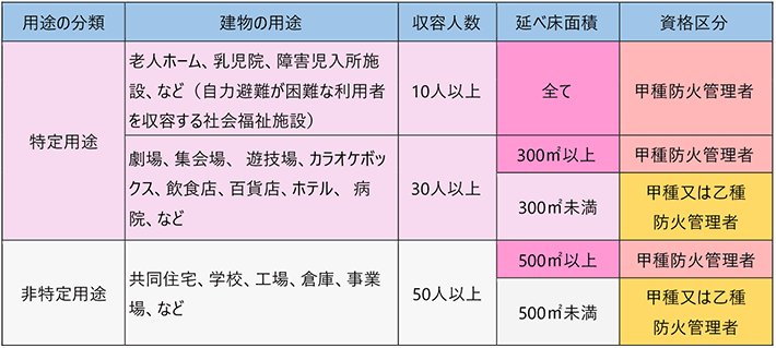 甲種・乙種の2種類があり、建物の用途と規模によって、以下のように必要な資格が分類されます。