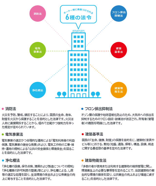 また、ビルの管理にあたっては、今回ご紹介した消防法をはじめ、多岐にわたる法令が定められています。*6